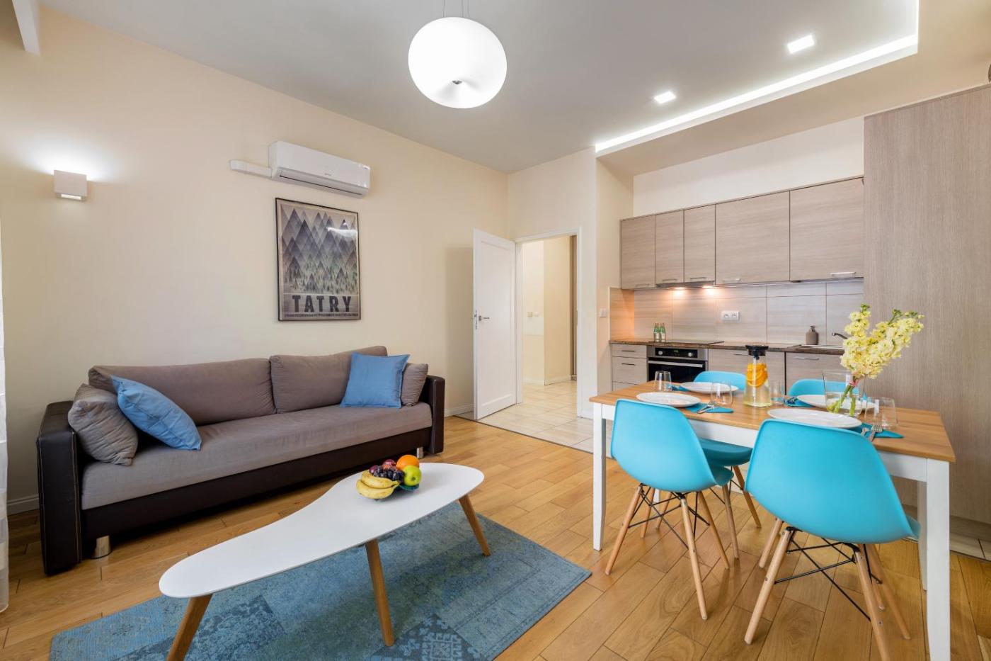 Apartament typu Deluxe. Featuring a private entrance, this air-conditioned apartment is comprised of 1 living room, 1 separate bedroom and 1 bathroom with a walk-in shower and a bath or a shower. Guests can make meals in the kitchen that is fitted with a stovetop, a refrigerator, a dishwasher and kitchenware. The apartment offers a flat-screen TV, a washing machine, soundproof walls, a tea and coffee maker as well as ancourtyard view. The unit offers 3 beds. Apartament - 7 osobowy. Powierzchnia pokoju ok.: 54 mkw. ;