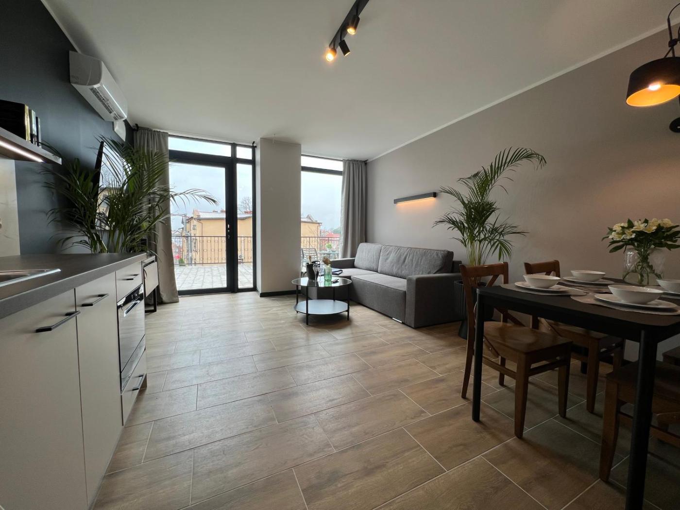 Apartament typu Suite z tarasem. This suite includes 1 living room, 1 separate bedroom and 1 bathroom with a shower and free toiletries. In the well-equipped kitchen, guests will find a stovetop, a refrigerator, a dishwasher and kitchenware. This suite is air-conditioned and has a seating area with a flat-screen TV, a washing machine, a tea and coffee maker, a dining area, as well as a wardrobe. The unit has 2 beds. Apartament typu Suite - 4 osobowy. Powierzchnia pokoju ok.: 40 mkw. ;